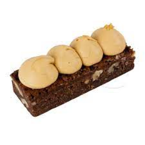 Брауни, приготовленный на темном 53% шоколаде, с грецким орехом и взбитой соленой карамелью.