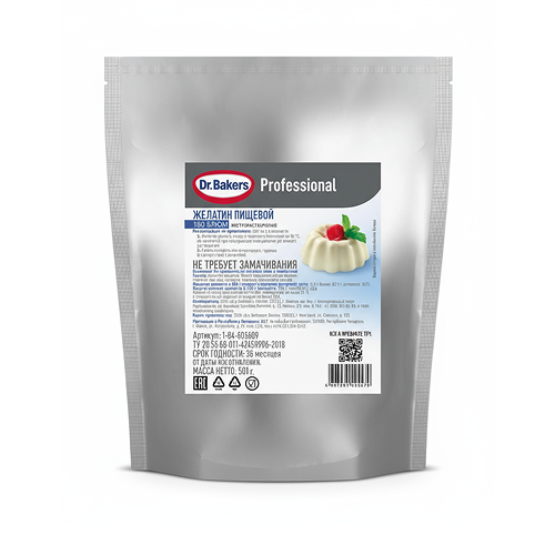 Желатин пищевой Dr.Bakers, 180 блюм, — универсальный продукт для приготовления вкусных десертов и блюд. Обладает высокой желирующей функцией, что обеспечивает получение плотных и прозрачных желе, муссов, паштетов и других кулинарных изделий.